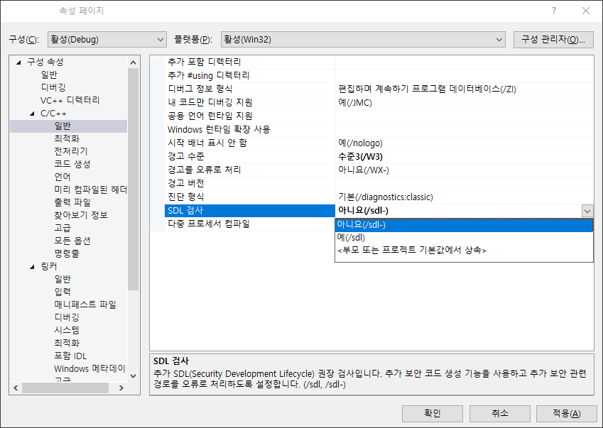 애초에 프로젝트 생성시 SDL 해제하는게 제일 편함
