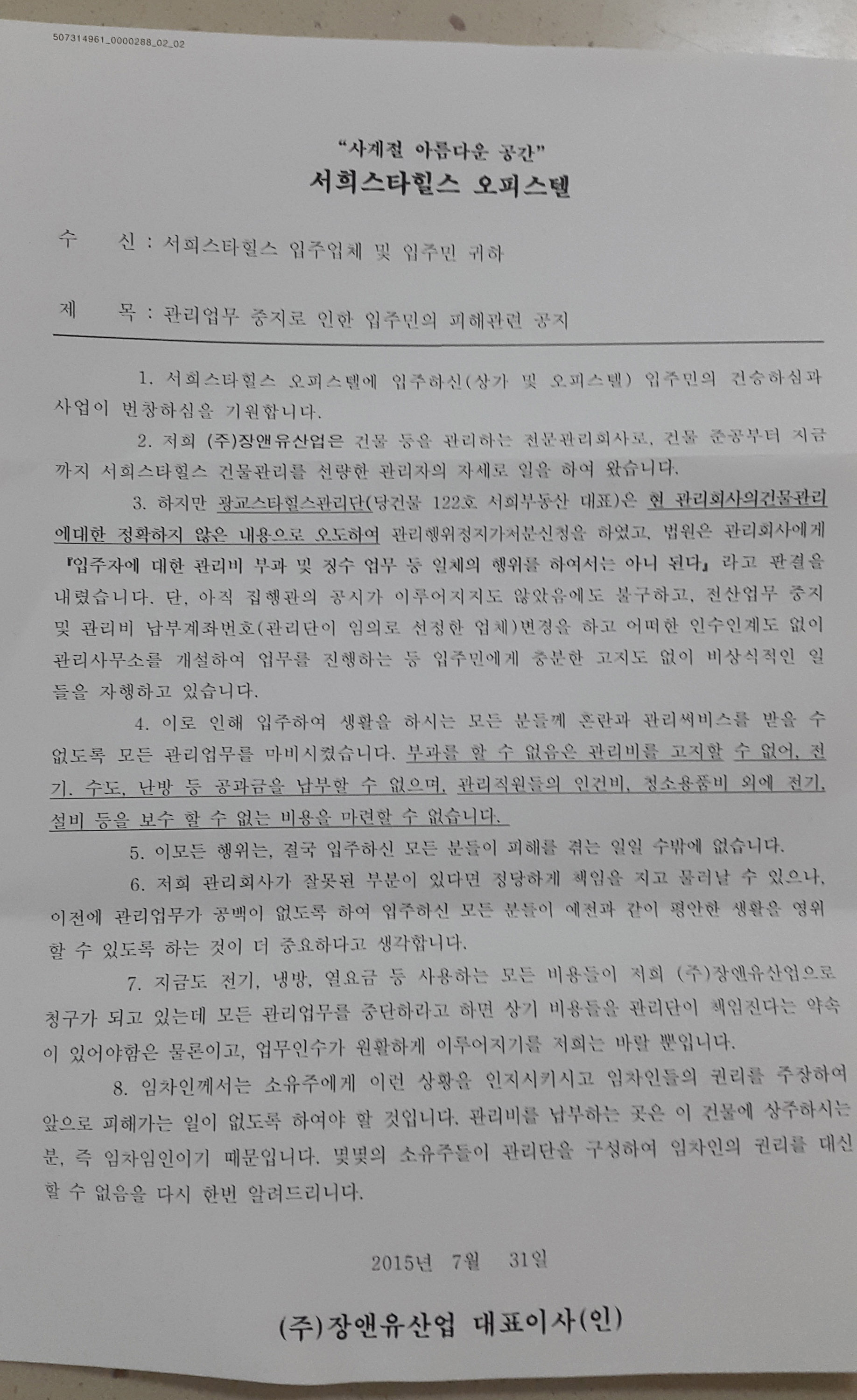 (주)장앤유산업과 광교스타힐스관리단의 데스매치가 있었고