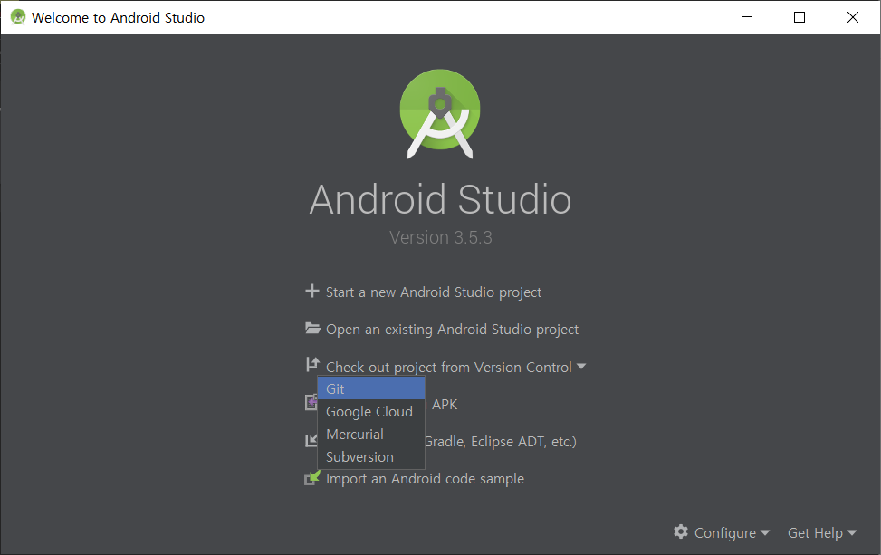 안드로이드 스튜디오의 첫 화면에서