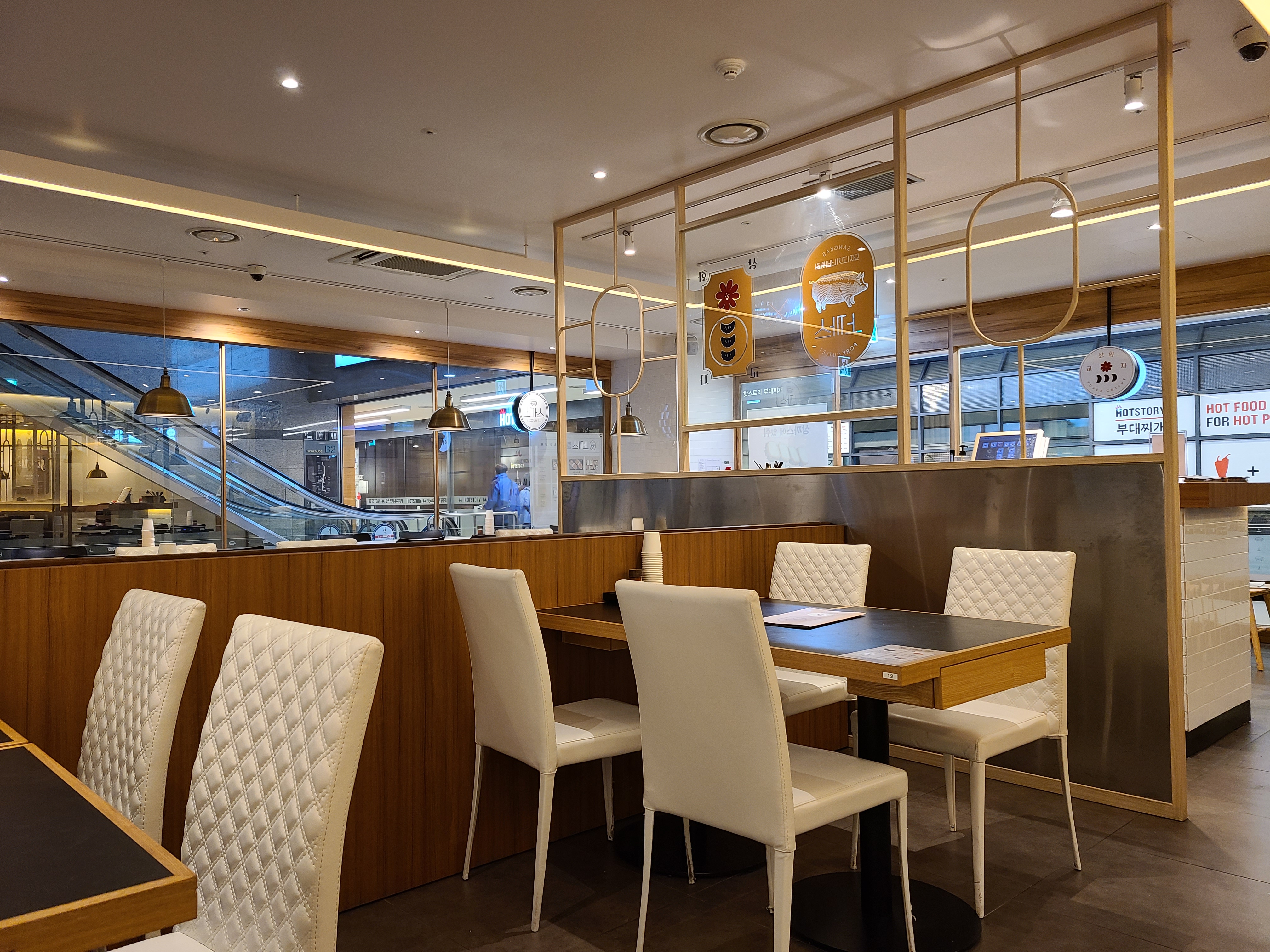둥근 돈까스 같은 간판과 따뜻한 조명을 가진 실내