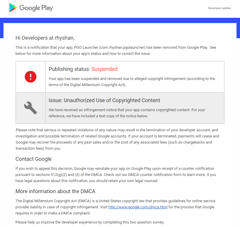 AppDetex라는 대행사에서 포켓몬고 저작권에 대한 문제를 제기한 결과입니다.