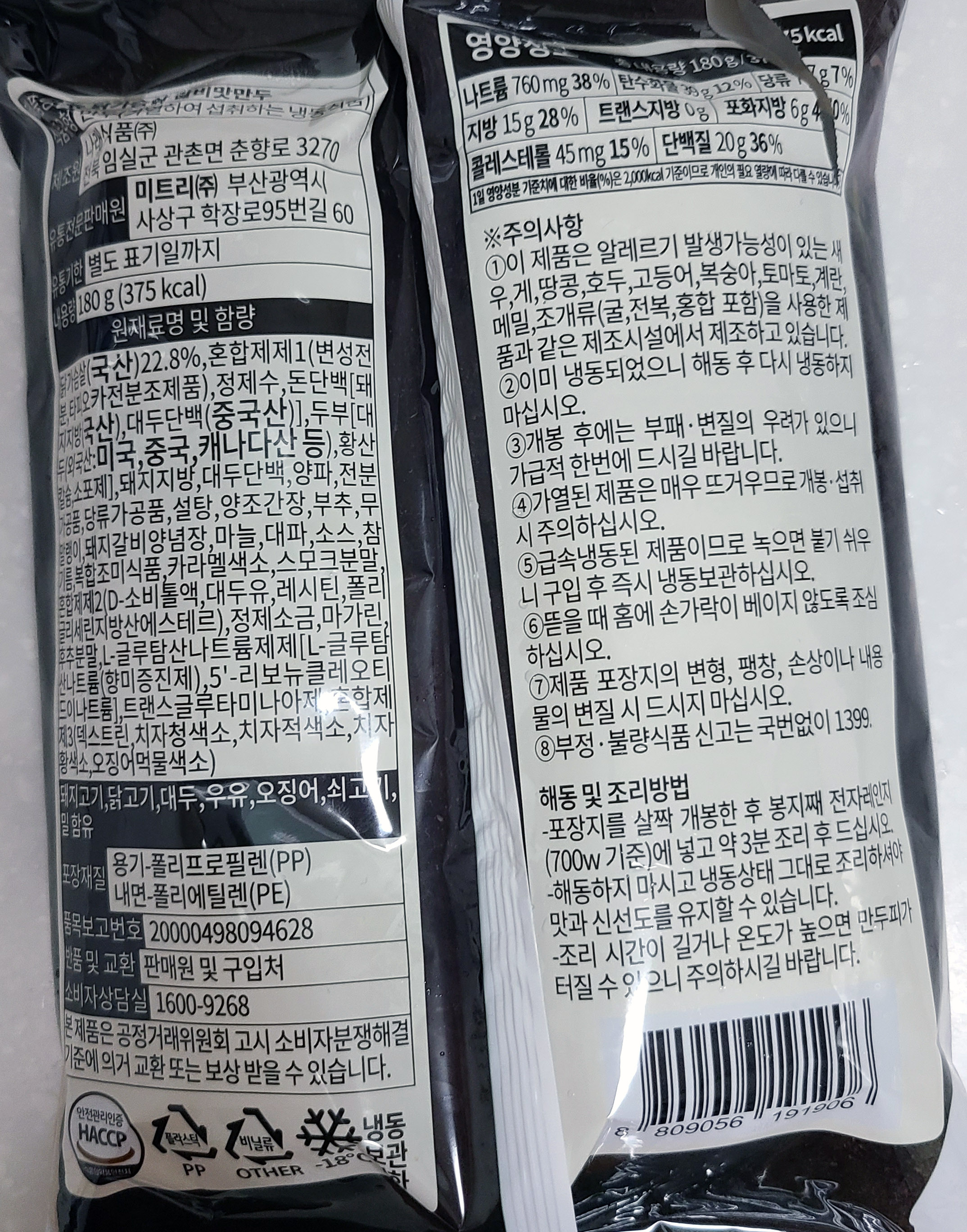 해동하지 말고, 살짝 찢어 봉지째 전자레인지에 3분 돌리라고 하네요.