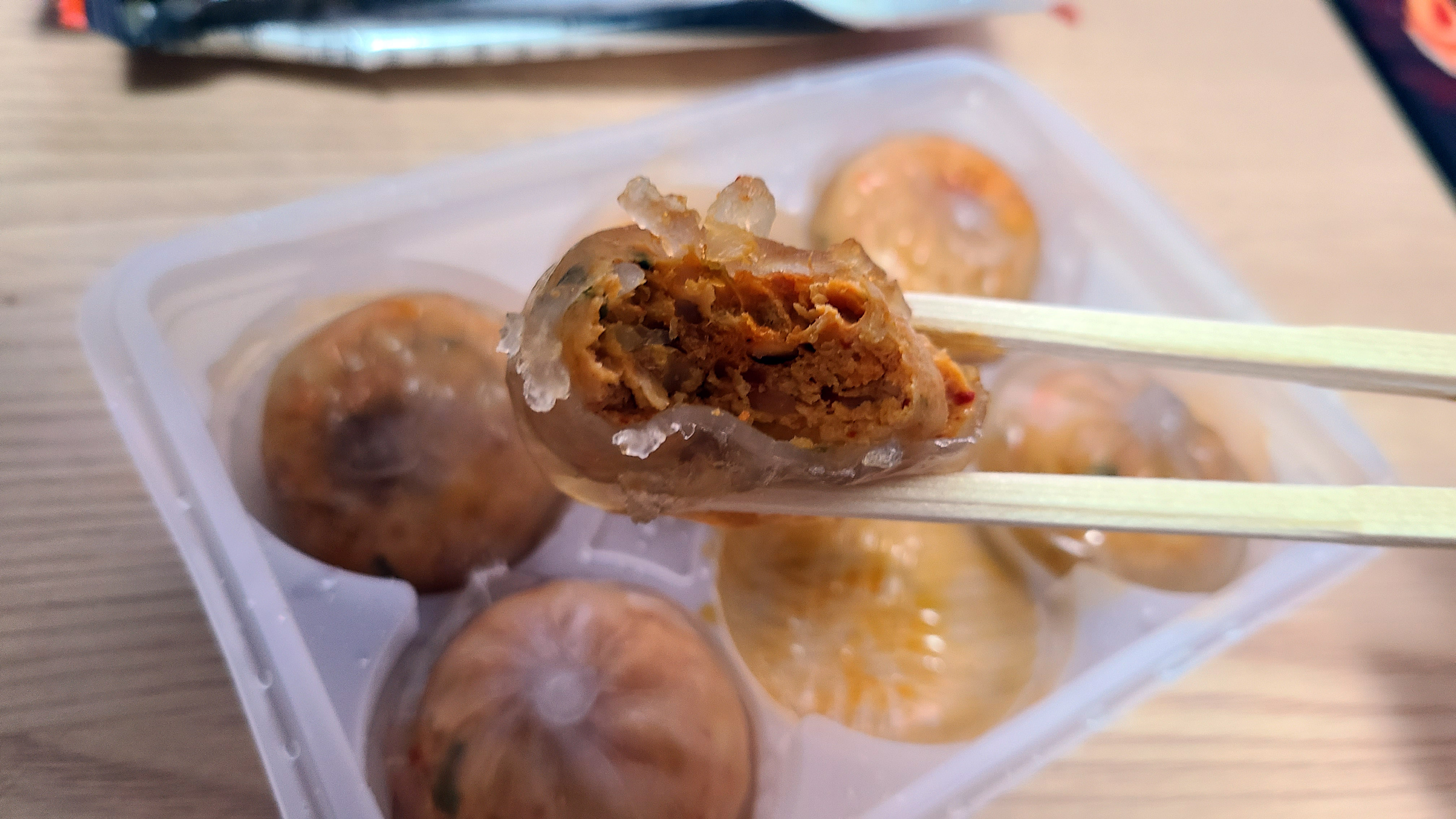 닭가슴살을 둘러싸고 있는 감자 전분 만두피가 야들야들하면서 쫄깃해 식감이 좋습니다.