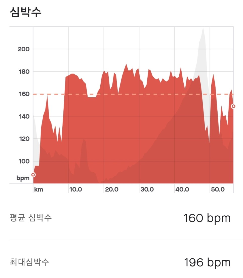 56.7km 동안 2~3번의 심박 드랍이 있었지만